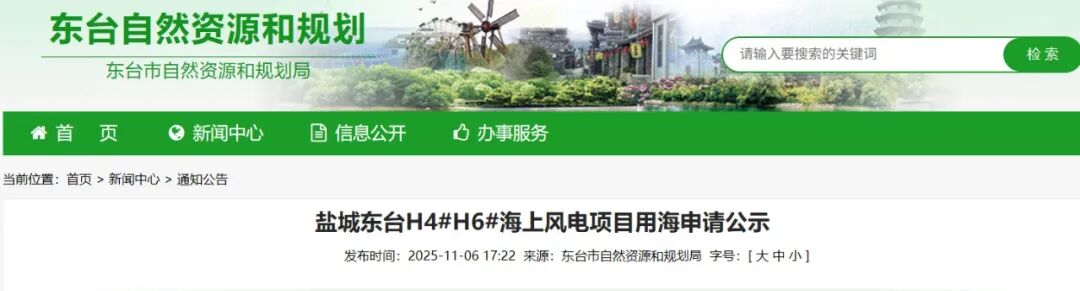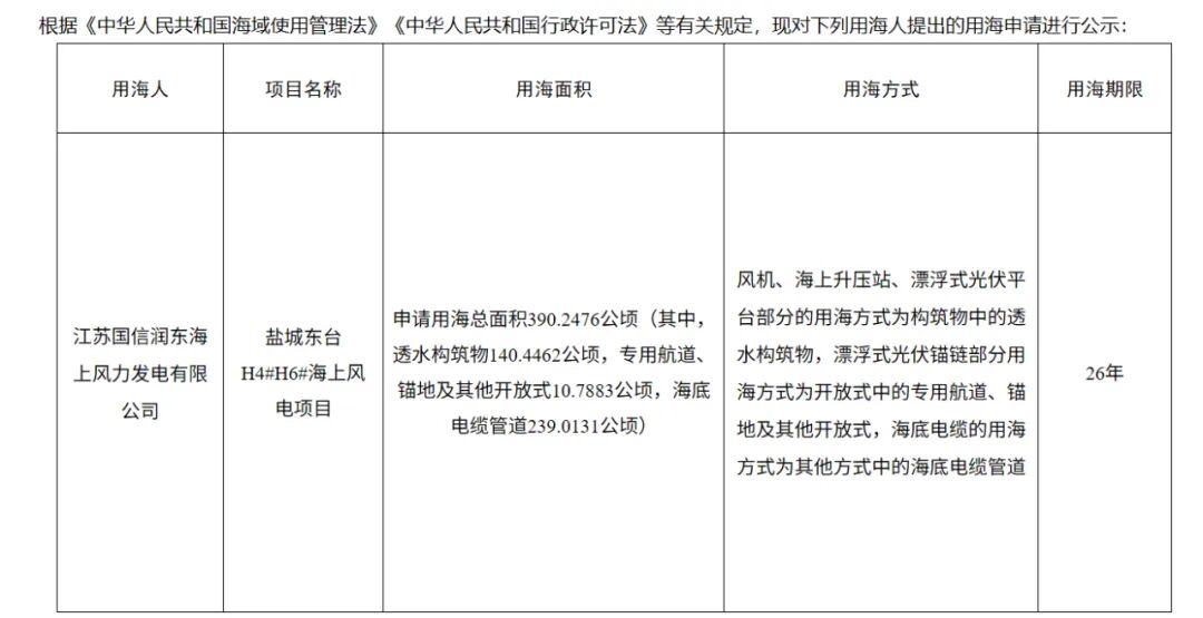 11月6日,江苏省盐城市东台市自然资源和规划局发布《盐城东台H4#H6#海上风电项目用海申请公示》。
