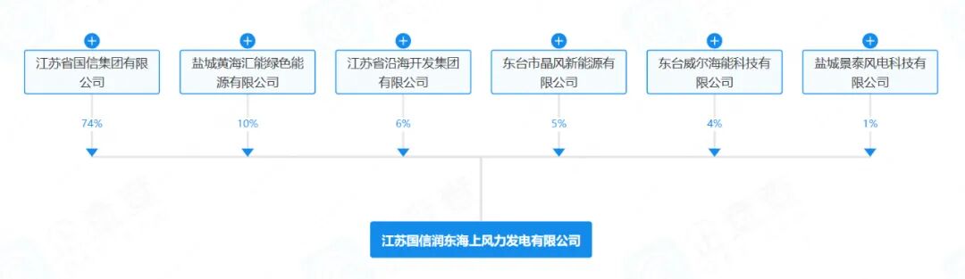 企查查显示,江苏国信润东海上风力发电有限公司成立于2025年10月31日,注册资本为67500万元,由江苏省国信集团有限公司(74.00%)、盐城黄海汇能绿色能源有限公司(10.00%)、江苏省沿海开发集团有限公司(6.00%)、东台市晶风新能源有限公司(5.00%)、东台威尔海能科技有限公司(4.00%)、盐城景泰风电科技有限公司(1.00%)共同持股。