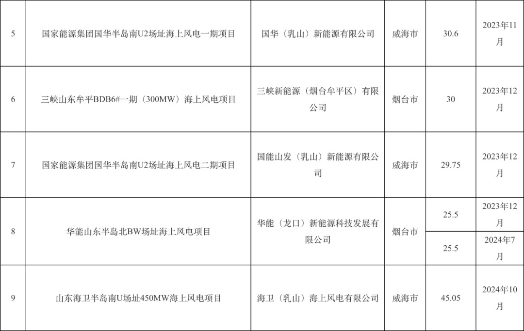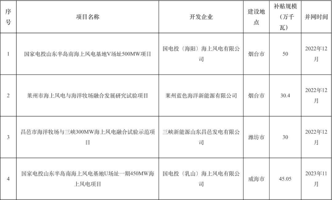 为落实《山东省人民政府关于印发2022年“稳中求进”高质量发展政策清单(第二批)的通知》(鲁政发〔2022〕4号)、《山东省人民政府关于印发2023年“稳中向好、进中提质”政策清单(第一批)的通知》(鲁政发〔2022〕18号)、《山东省人民政府关于印发2024年“促进经济巩固向好、加快绿色低碳高质量发展”政策清单(第一批)的通知》(鲁政发〔2023〕13号)等部署要求,对2022—2024年建成并网的海上风电项目给予财政补贴,补贴资金分运营年度拨付到位。我局根据《山东省海上风电财政补贴资金管理办法》(鲁财建〔2024〕23号)等文件有关规定,组织对烟台、威海、潍坊市上报的2025年度海上风电省级财政补贴资金申报材料进行了复审。经复审,烟台、威海、潍坊市上报的9个海上风电项目补贴申报材料符合要求,现将项目基本信息及补贴规模公示如下: