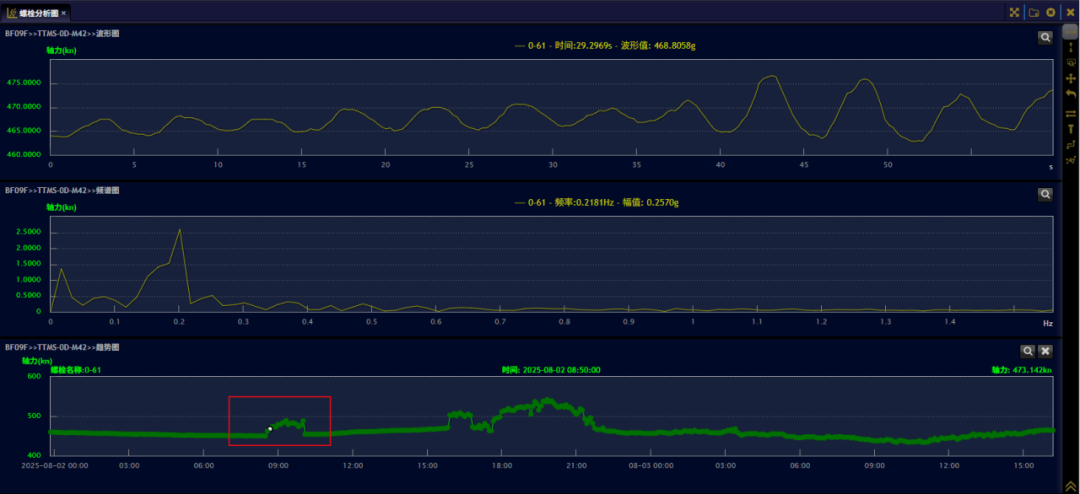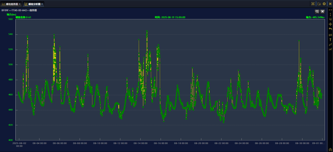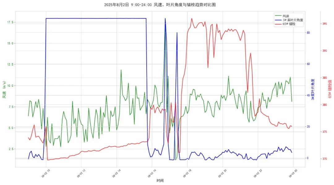 2025年8月2日的监测数据显示,69#锚栓在上午出现明显轴力跳变,其他智能锚栓也有同样的现象。