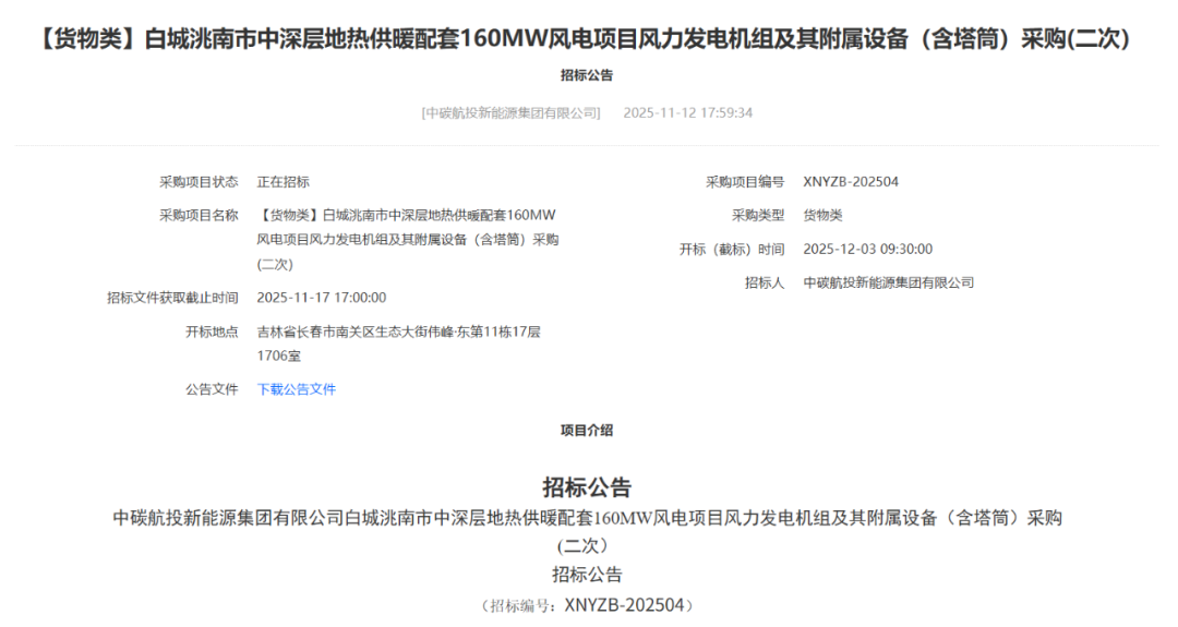 同日,中碳航投新能源集团有限公司白城洮南市中深层地热供暖配套160MW风电项目风力发电机组及其附属设备(含塔筒)采购(二次)招标公告发布。