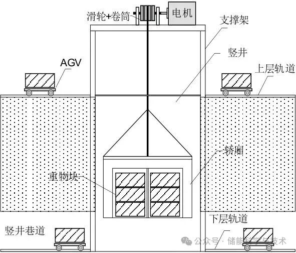 以全球首个竖井式重力储能工程化应用项目为例,16 MW竖井式重力储能系统主要包括重物块、AGV、轿厢、竖井、巷道、地面平台和井底平台、上下层轨道、支撑架、滑轮、电机等部件。系统上下层储存区为平行的相同结构,AGV为水平转移重物块载体,系统通过轿厢实现重物块在高低平台间的升降,并通过电机完成机械能和电能之间的相互转化。工程中,地下竖井深可达1000 m,重物块最大质量为104 t,其系统基本结构如图1所示。