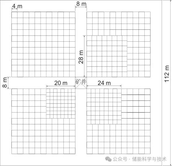 为方便重物块的运输和管理,以“田”字形储存区域分别对不同质量等级的重物块进行储存,其中中心交汇处为矿井位置,该方案中此处放置四台电机。方格处为重物块储存区,根据表2中各级重物块尺寸,每个储存区设计为边长44 m的正方形,其余部分为宽8 m的运输道路,如图2所示。左上区域为104 t重物块储存区,共可储存121块;此布局为其他质量等级重物块的储存提供了模板,通过按比例调整储存区的尺寸,确保其他质量等级的各64块重物块紧邻矿井侧,以实现快速调运;剩余空间储存104 t重物块,以实现空间的最大化利用。
