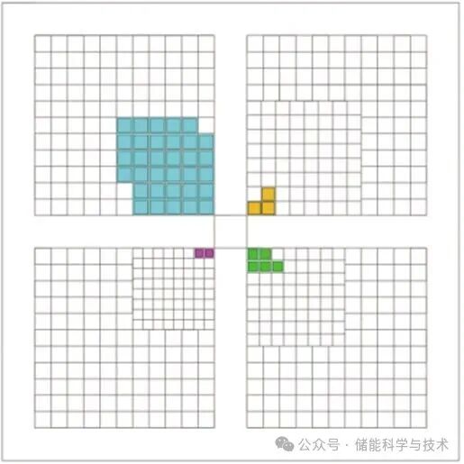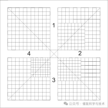 在AGV运行过程中,通过调研得知重载AGV运行的最大速度可以达到1 m/s。由于重载AGV运行速度低,仅一辆AGV无法在时间约束下完成重物块的运输任,需4辆AGV协调运行的方式,使其与4台电机一一对应。再次对重力储能系统总储存区进行分区处理,使每一辆AGV负责运输相应区域的重物块,具体分区情况如图6所示。对于对角线处重物块,根据相邻两个区域的运输车运行的情况,处于空闲的AGV来完成运输任务。