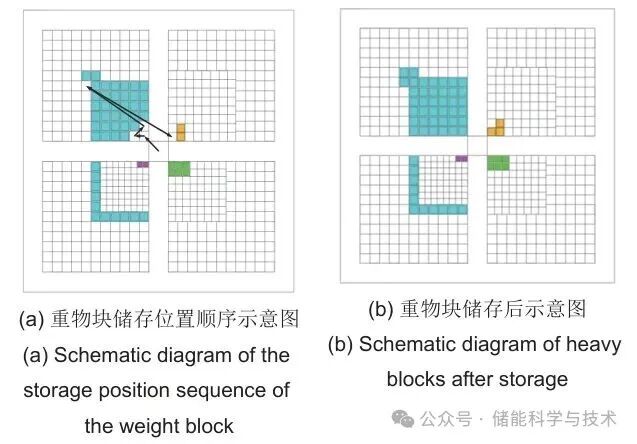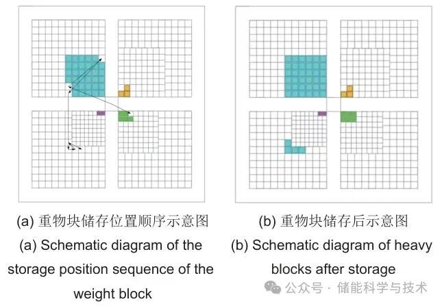 在12:45—13:00时间段内,系统需要继续储存重物块,由于在上一个时间段上层储存区有重物块取出而导致矿井附近出现无重物块储存的情况,所以在后续重物块需要再次储存和运输时应先填补空缺位置,空缺填补后再重新进行后续的储存与运输,12:45—13:00需要储存的能量约为1.34 MWh,对应重物块质量等级和个数为104 t重物块4块,70 t重物块1块。12:45—13:00时间段内重物块需要储存的位置顺序及重物块储存后的情况如图14所示。