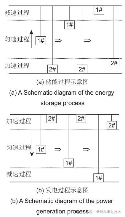 重物块在竖井中运行时需要经过加速过程、匀速过程和减速过程三个过程,当重物块运行达到额定速度时,电机达到额定功率,以两个重物块为例重力储能系统重物块具体运行示意图见图3。