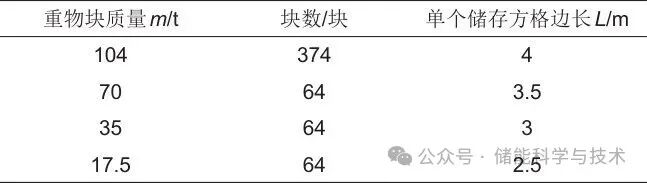 在众多储能技术中,电化学储能技术具有较高的技术成熟度。通过对多家电化学储能单元调研对比,比亚迪储能CS20H-B2982-A-R1M01型电池储能系统为最大单元输出功率,约为2700 kW。基于此,设计重物块最小质量等级能够满足额定速度下运行时,输出功率设定为2700 kW,更精细的功率响应可由混合储能优势互补完成。对于中间等级的重物块,每个质量块都是前一个的两倍,使得系统可根据电网功率需求灵活选择不同等级的重物块。设重物块形状为正方体,材料为混凝土(2500 kg/m3),具体重物块分级边长、质量及对应输出功率如表1所示。