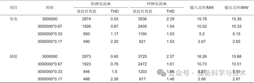 重力储能系统通过调整重物块的级数即改变负载转矩,实现与电网调功需求的精准匹配,灵活平抑功率波动。通过对四级重物块发电与储能8种运行工况对发电电动机进行底层控制仿真,运行结果如表4所示,可见,随着重物块质量降低网侧谐波总畸变率降低、机侧谐波总畸变率增加,表明重物块分级调节功率方法对网侧较友好,而对电机耐谐波能力要求提高。