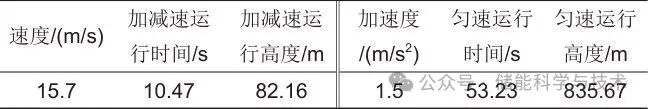 其中,P为电机的功率,m为重物块质量,g为重力加速度。考虑到电机起动、制动的时间过短可能导致起动电流过大,从而对电机和电网造成冲击,影响电机的使用寿命,启动、制动的时间过长则会导致电机绕组过热,加速绝缘老化,因此设定电机启动、制动的时间为10 s左右,具体求得重物块在竖井中运行的所有参数如表3所示。