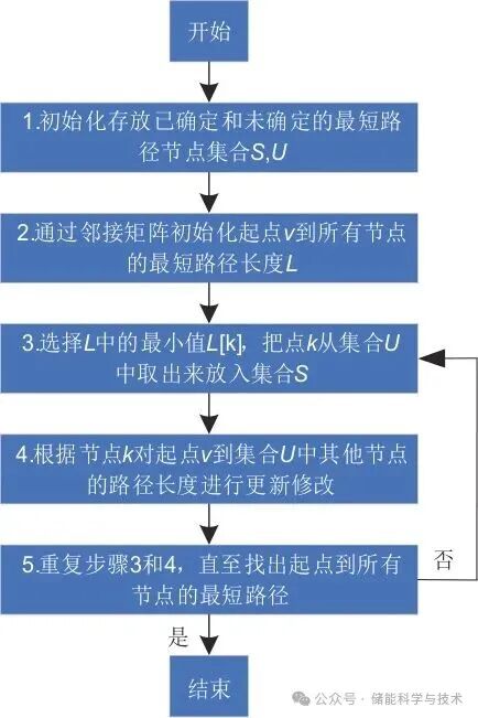 (4)迭代过程:重复执行步骤2和步骤3,直至集合U中的所有储存点均被纳入集合S中。此过程确保每个储存点的距离值反映从起始节点v出发的最短路径长度。