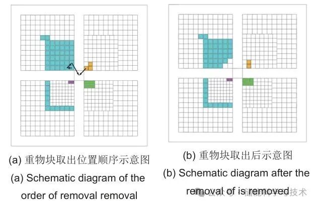 在12:30—12:45时间段内,系统需要取出重物块以释放能量,在取出重物块时,以距离矿井远近为原则,从距离矿井最近的位置依次开始取出并运输重物块直至将需要的块数全部运输,12:30—12:45需要释放的能量约为1.04 MWh,对应重物块质量等级和个数为104 t重物块3块,70 t重物块1块,12:30—12:45时间段内重物块需要取出的位置顺序及重物块取出后的情况如图13所示。