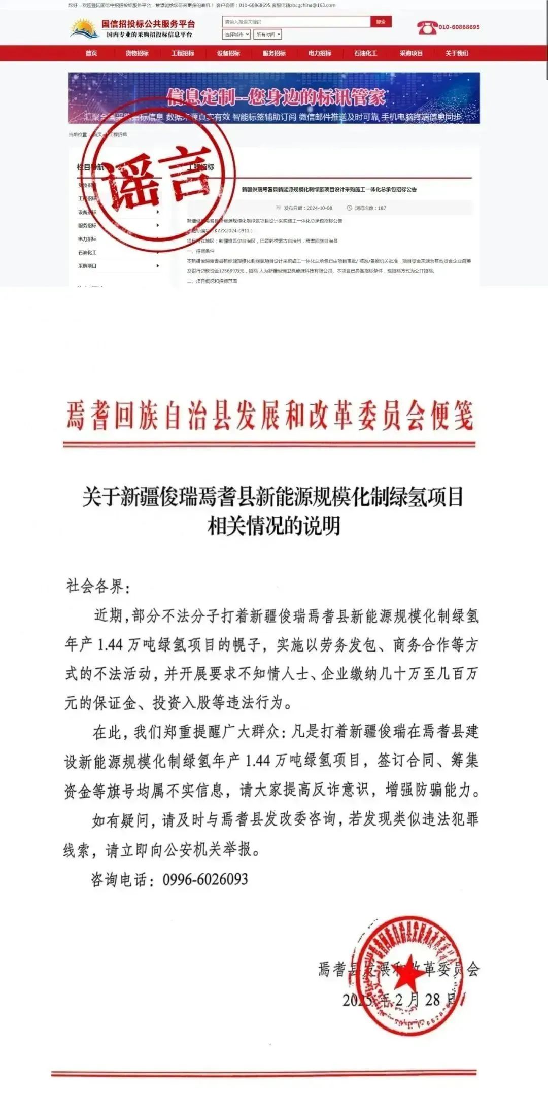 2025年3月,焉耆县发改委发布打假声明称:部分不法分子在互联网平台发布“新疆俊瑞焉耆县新能源规模化制绿氢年产1.44万吨绿氢项目”等信息,实施以劳务发包、商务合作等方式的不法活动,经证实凡是打着签订合同、筹集资金等旗号均属不实信息均均属不实信息。