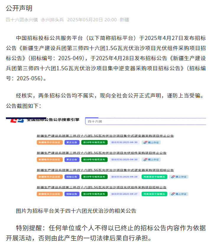 2025年5月,永兴排头兵官微发布公开声明称,招标平台发布《新疆生产建设兵团第三师四十六团1.5G瓦光伏治沙项目光伏组件采购项目招标公告》、《新疆生产建设兵团第三师四十六团1.5G瓦光伏治沙项目集中逆变器采购项目招标公告,经核实,两条招标公告均不属实,现向全社会公开正式声明,谨防上当受骗。