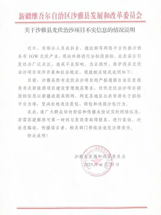 2025年6月,网传“沙雅县有1GW光伏产业”向外部进行分标段招标的信息,沙雅县发展和改革委员会发布打假声明。