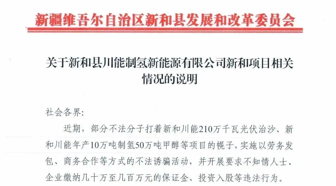 2025年2月,新疆新和县发改委曾发布一则辟谣公告称,凡是以“新和县川能210万千瓦光伏治沙”“新和川能年产10万吨制氢50万吨甲醇(含储能、光伏治沙、源网荷储等)项目”名义签订合同、招募资金或发布融资信息的,均属不实信息。