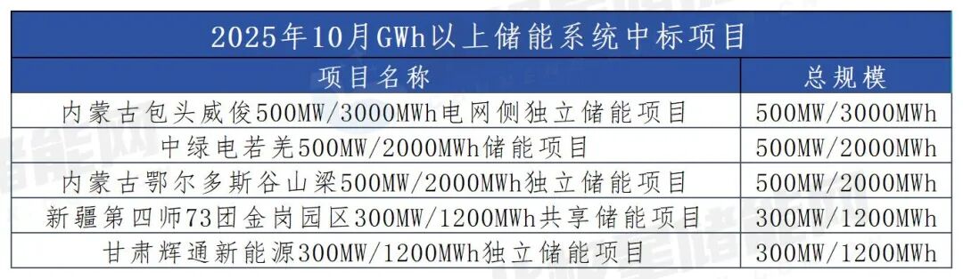 另外,10月储能系统中标项目呈现规模化趋势,5个GWh级别的大单总规模达9.4GWh,贡献了当月近六成(58.3%)的市场份额,显示出GWh级项目主导的市场格局日益明晰。