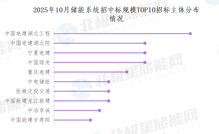 2025年10月储能系统招标主体的前三名为中国电建湖北工程,中国电建湖北院以及宁夏电建,中国电建以绝对优势位列招标规模第一。