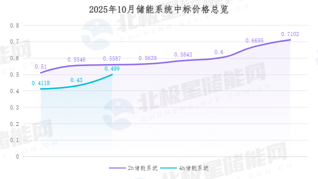 2025年10月,4h储能系统的投标价格为0.43元/Wh-0.616元/Wh,中标价格为0.4118元/Wh-0.499元/Wh,平均中标价格为0.4469元/Wh;