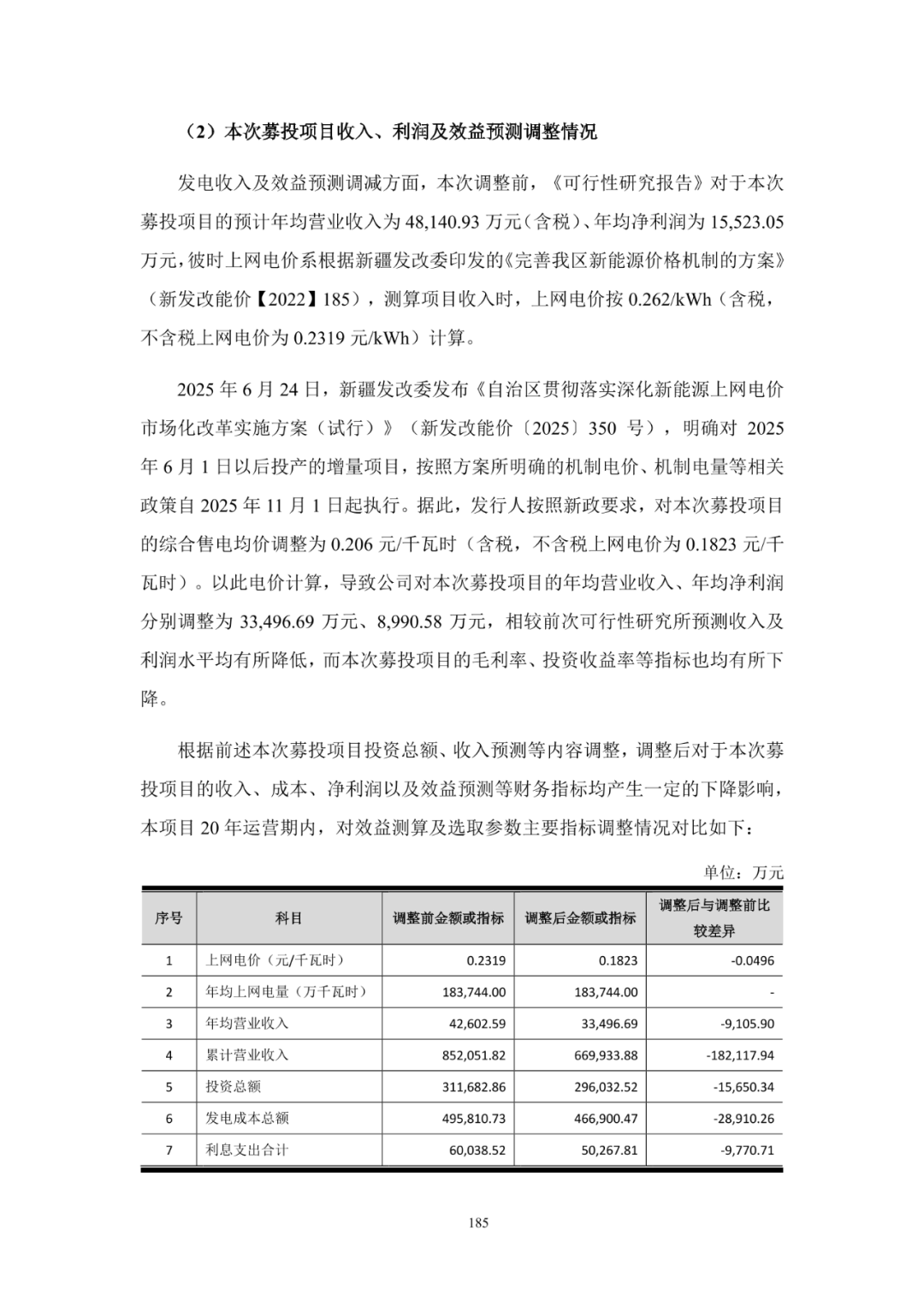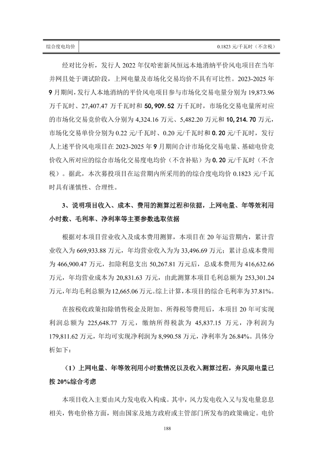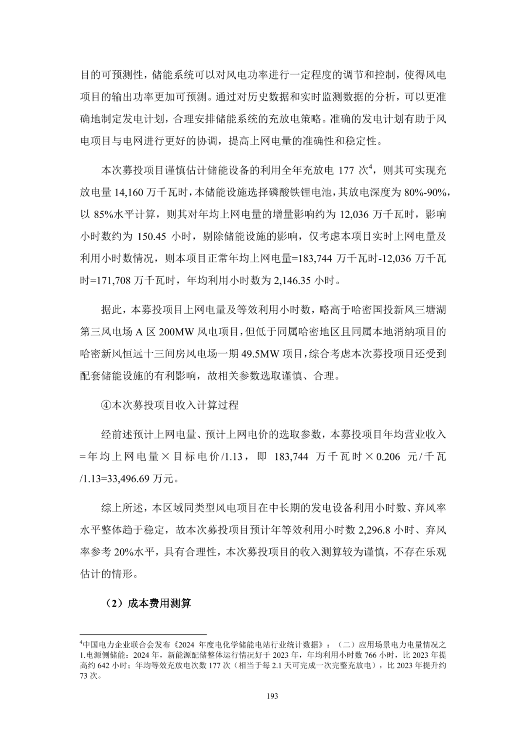本次募投项目谨慎估计储能设备的利用全年充放电177次,则其可实现充放电量14160 万千瓦时,本储能设施选择磷酸铁锂电池,其放电深度为80%-90%,以85%水平计算,则其对年均上网电量的增量影响约为12036 万千瓦时,影响小时数约为150.45小时,剔除储能设施的影响,仅考虑本项目实时上网电量及利用小时数情况,则本项目正常年均上网电量=183,744 万千瓦时-12,036 万千瓦时=171708万千瓦时,年均利用小时数为2146.35小时。