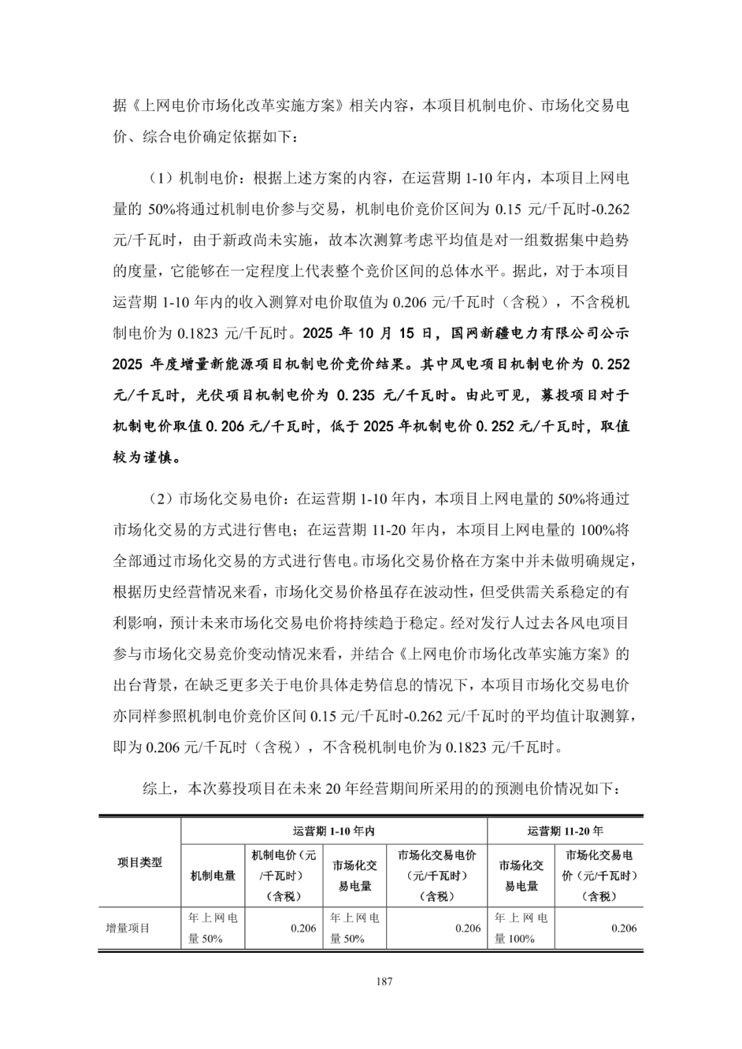 以综合度电均价0.206元/kWh(含税)进行测算,项目年均营业收入=年均上网电量×目标电价/1.13,即183744万千瓦时×0.206元/千瓦/1.13=33496.69万元。