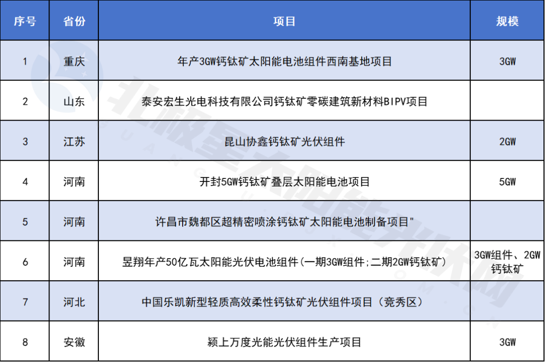 同样值得关注的还有钙钛矿项目,目前河南、河北、江苏、安徽、重庆、山东等地都出现了GW级别的钙钛矿项目,这一现象标志着钙钛矿正逐步走向量产阶段。