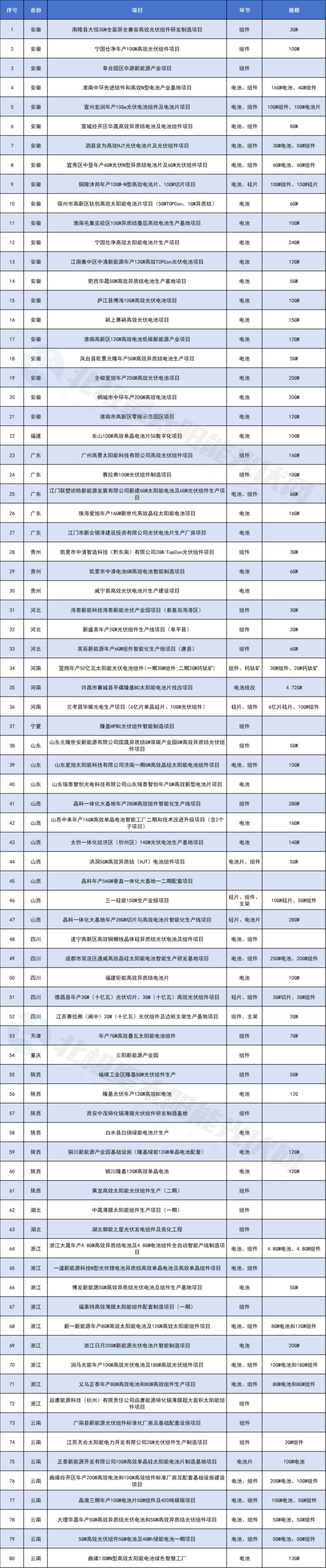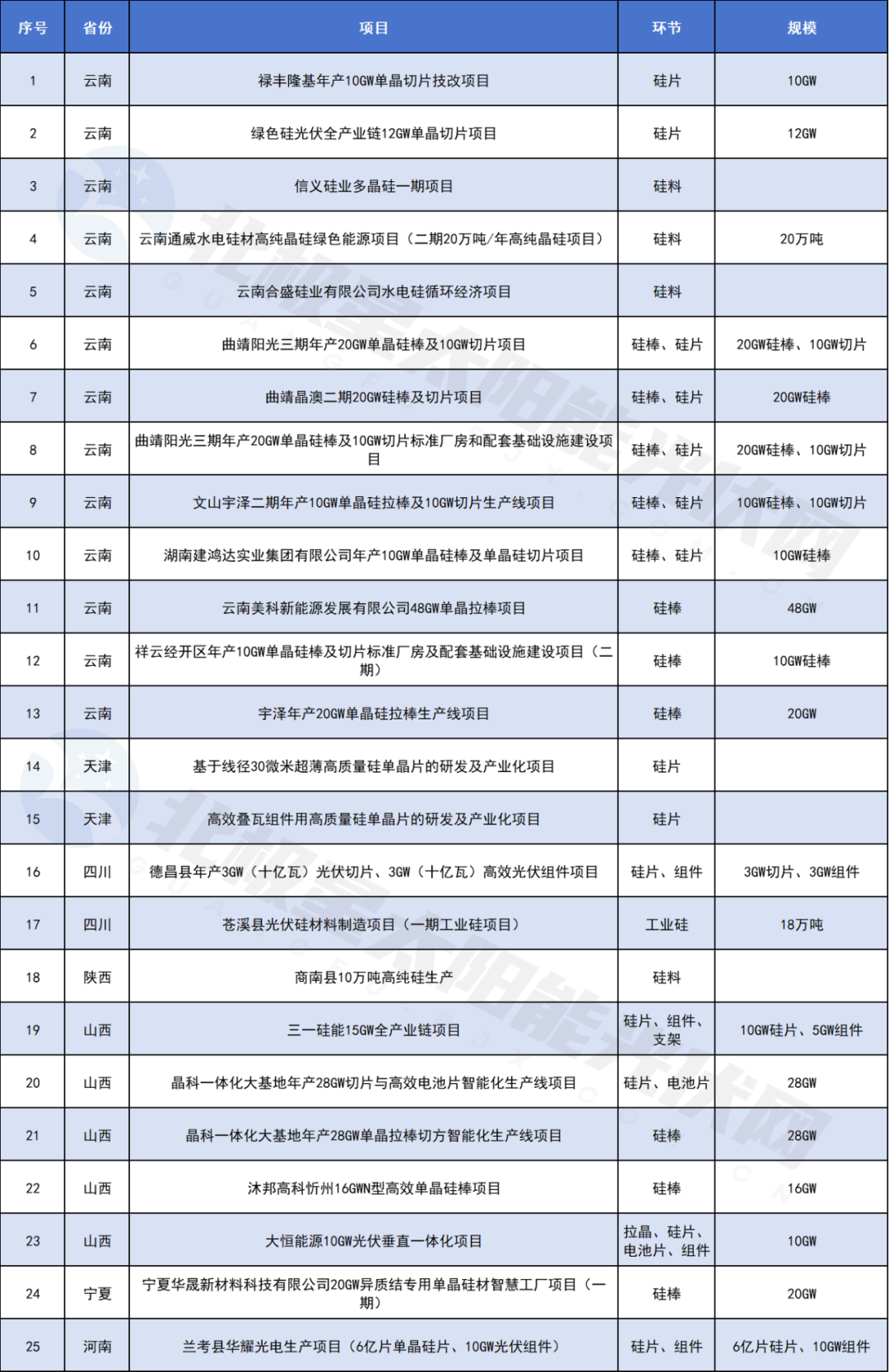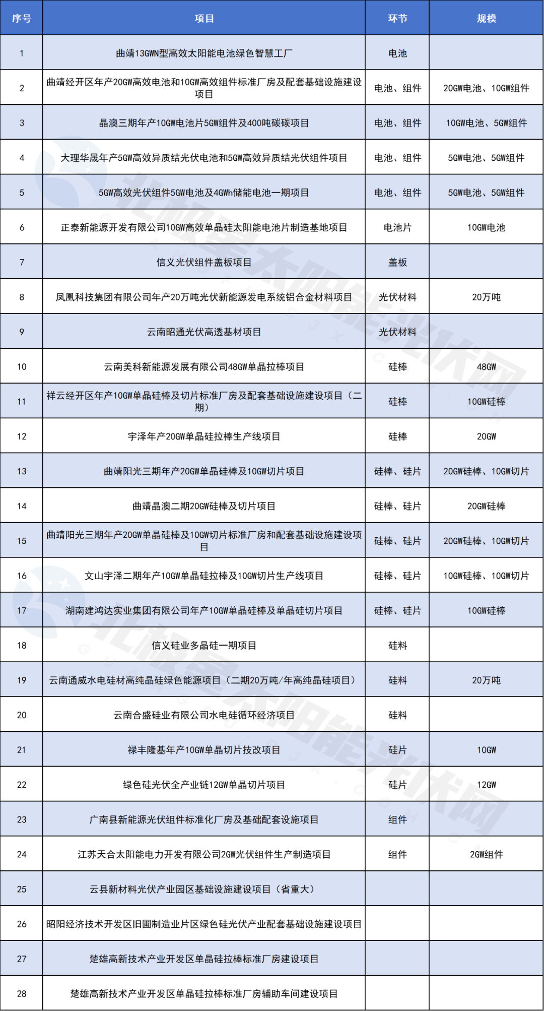 云南同样是近两年扩张较为积极的省份,与安徽不同的是,不仅在下游电池、组件环节有一定规模,硅料、硅棒、硅片等上游环节,更是其扩张重点,大多项目的规模都在10GW、20GW。