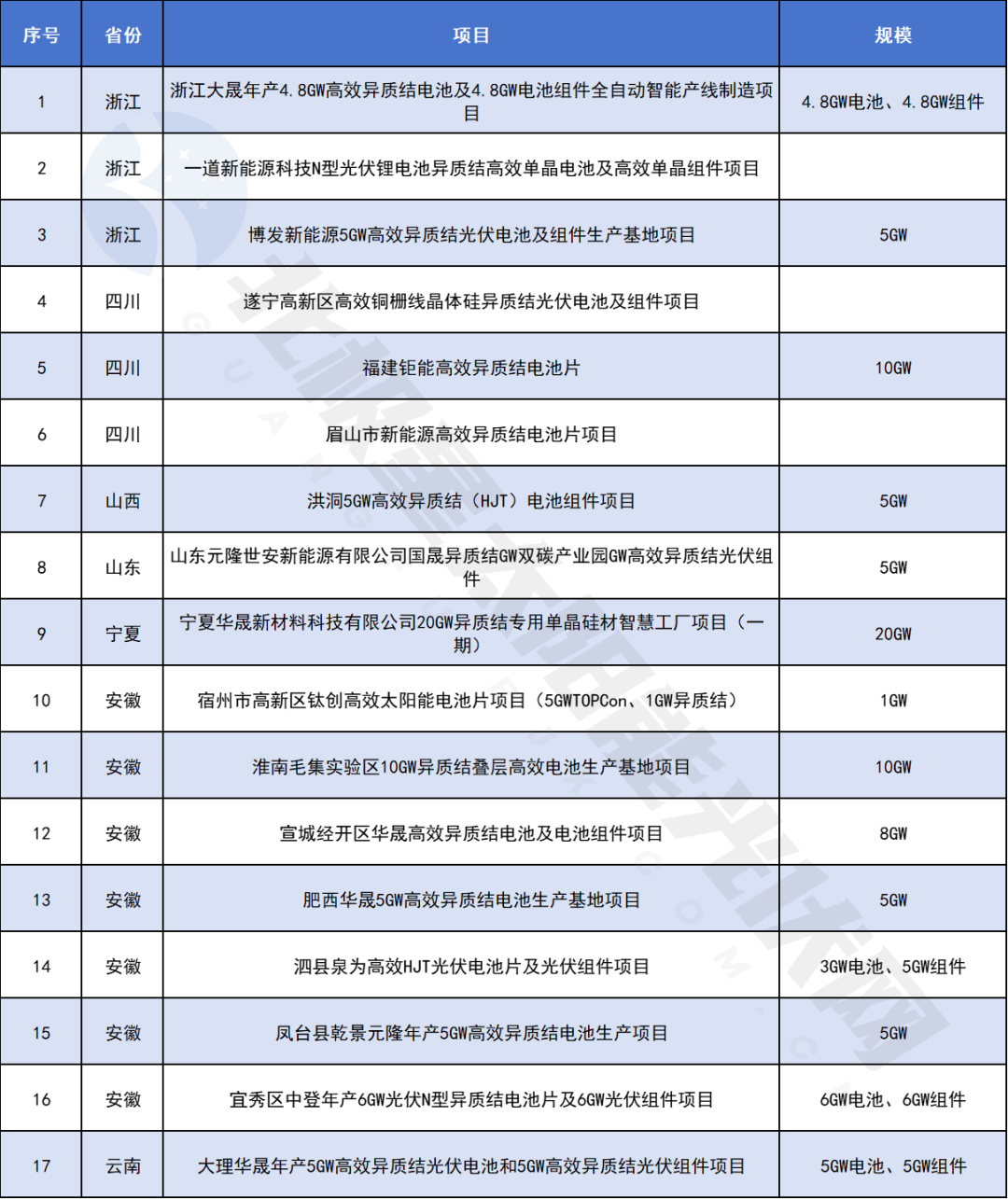 2025年的重点项目清单显示,异质结和钙钛矿项目开始大规模出现。浙江、安徽、山东、山西、宁夏等省份的重点项目名单中,均有异质结项目的身影,不过其规模多在10GW以下。