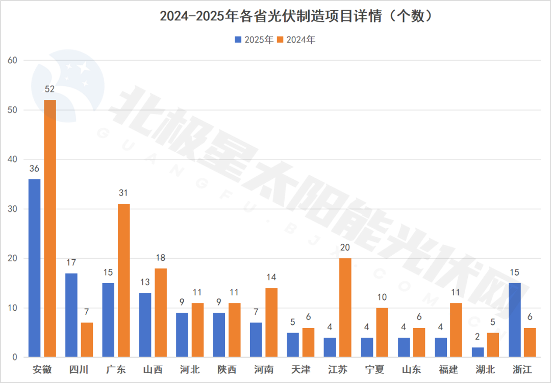 传统的光伏重镇江苏、浙江,近两年纳入重点项目的光伏制造项目数量较少。尤其是江苏,2025年重点项目逐步向储能领域集中,光伏制造项目数量明显减少。