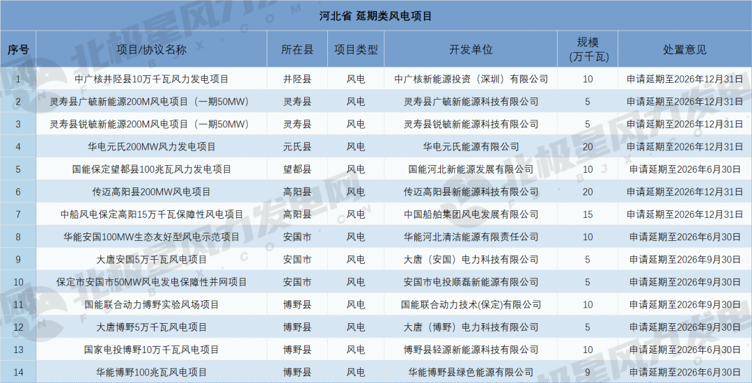 延期项目则呈现"一家企业一个项目"的分散格局,涉及14家不同开发企业,其中不乏中广核、华电、国能等大型央企。中广核新能源投资(深圳)有限公司的中广核井陉县10万千瓦风力发电项目、华电元氏能源有限公司的华电元氏200MW风力发电项目、国能河北新能源发展有限公司的国能保定望都县100兆瓦风力发电项目等均在列。