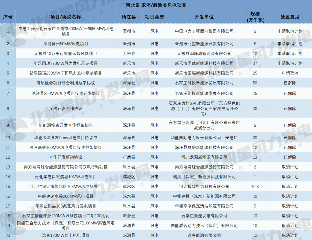 取消项目中,新乐市国瑞新能源科技有限公司的两个项目尤为突出,37万千瓦新乐国瑞370MW风力发电示范项目与25万千瓦新乐国瑞250MW风力发电示范项目合计规模达62万千瓦,占所有取消项目总规模的40.5%。此外,晋州市两个5万千瓦项目(中电工程河北石家庄晋州市300MW(一期50MW)风电项目、深能晋州50MW风电项目)及无极县10万千瓦智慧运营风储项目也被纳入取消名单。