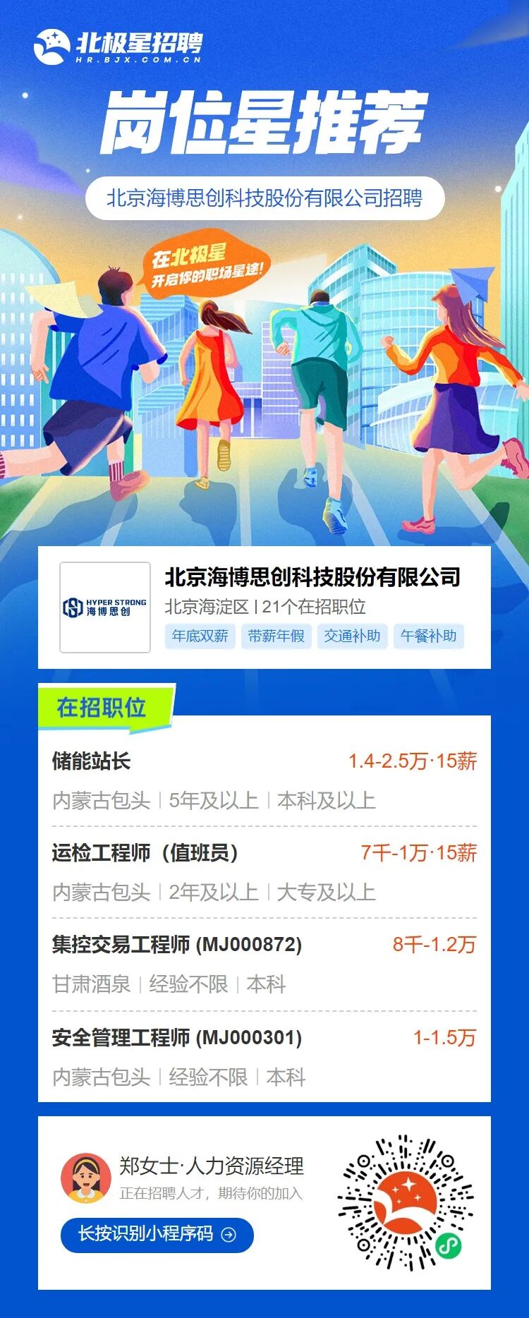 原标题:海博思创21岗位招聘!储能站长、值班员、集控交易工程师等!