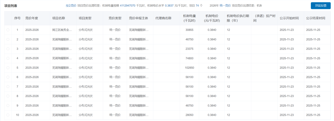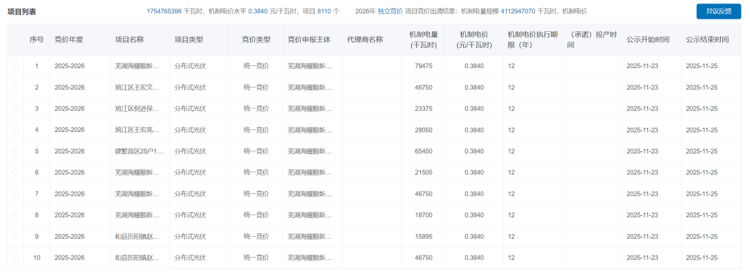 11月23日,安徽公示2025-2026年新能源增量项目机制电价竞价结果。