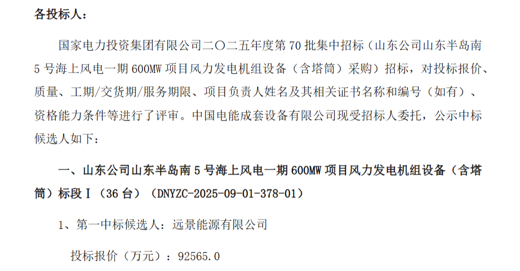 11月21日,国家电投发布广东公司阳江三山岛三海上风电场项目风力发电机组及附属设备采购、山东公司山东半岛南5号海上风电一期600MW项目风力发电机组设备(含塔筒)采购中标候选人公示。