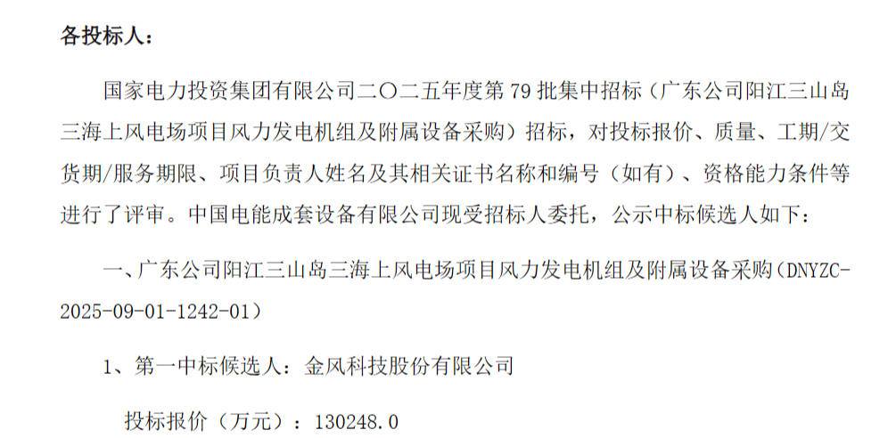 公告显示,第一中标候选人:金风科技,投标报价:130248.0万元。第二中标候选人:东方风电,投标报价:124320.0万元。