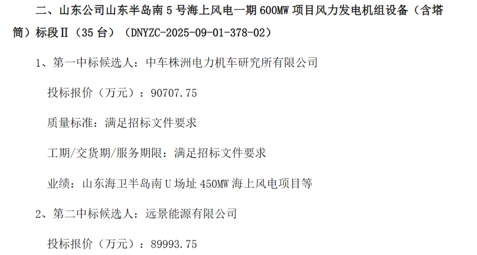 标段I(36台):第一中标候选人:远景能源,投标报价:92565.0万元。第二中标候选人:中车株洲所,投标报价:93360.6万元。
