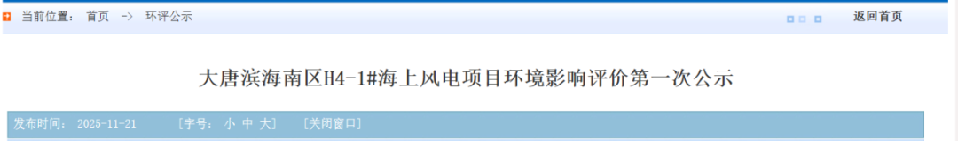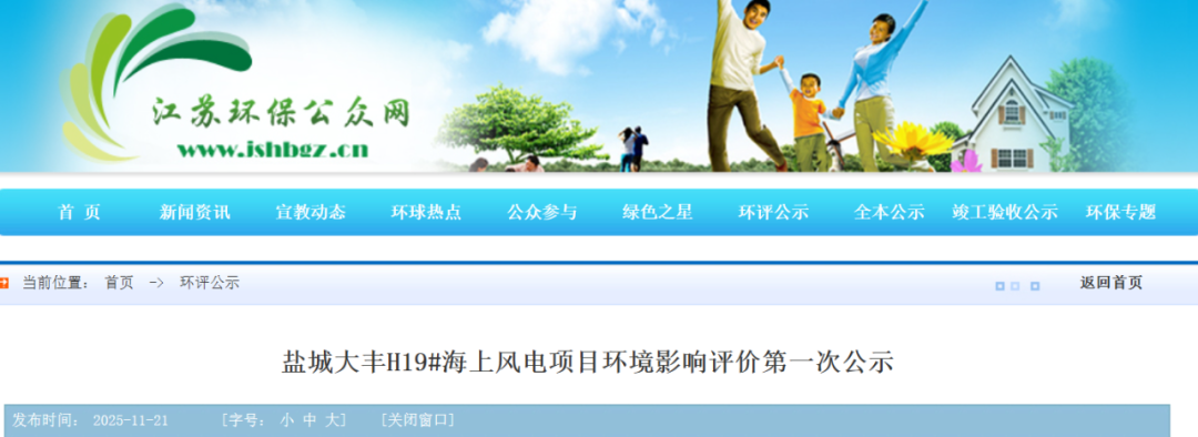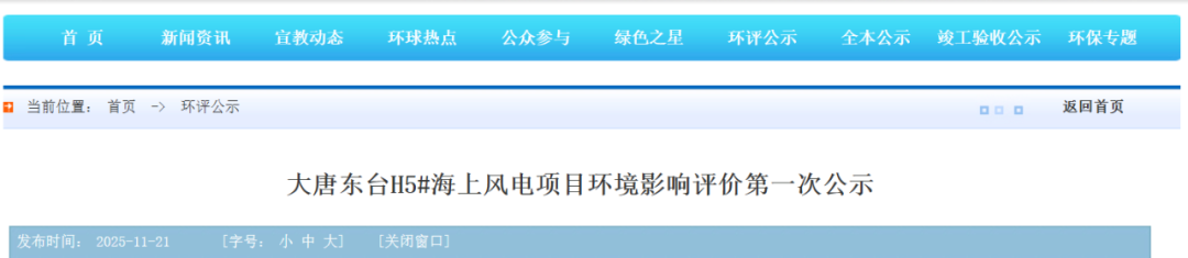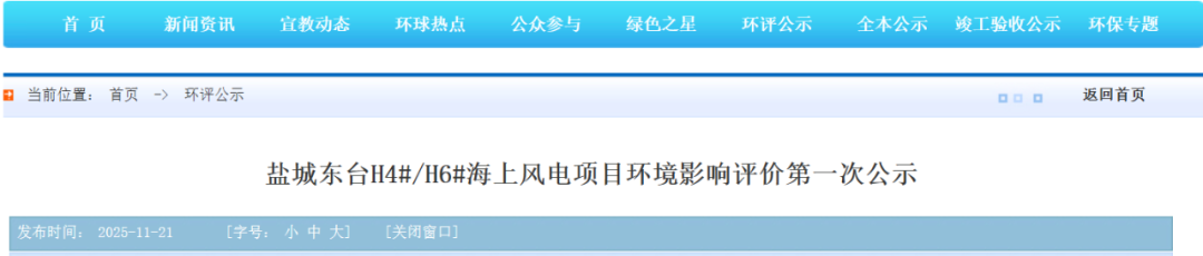 11月21日,江苏环保公众网发布盐城大丰H19#海上风电项目、盐城东台H4#/H6#海上风电项目、大唐东台H5#海上风电项目、大唐滨海南区H4-1#海上风电项目环境影响评价第一次公示。