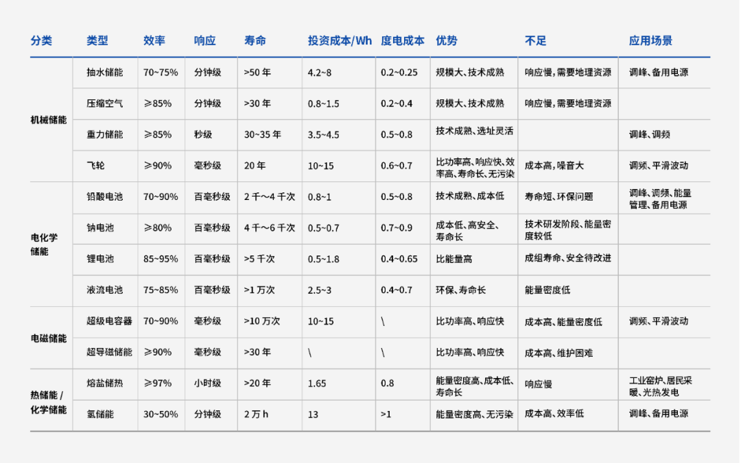 综上可见,储能技术路线百花齐放,各有千秋。机械储能以抽水蓄能为核心,在大容量长时调节领域具有成本优势,但受地理条件限制较大;电磁储能凭借毫秒级响应速度占据高频调节场景,却因能量密度低和成本问题难以大规模应用;热储能与化学储能则更聚焦于特定场景的能源形态转换,全链条效率仍有提升空间。