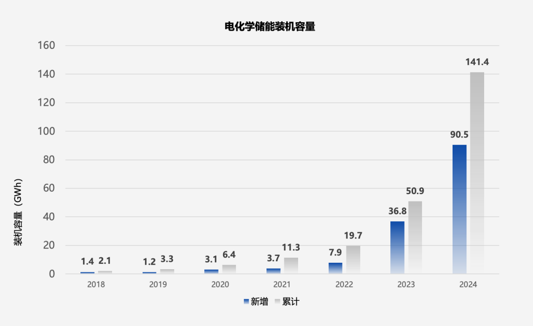 近年来,在政策支持与市场需求的双向驱动下,我国电化学储能市场呈现“井喷式”增长。据中国电力企业联合会发布的《2024年度电化学储能电站行业统计数据》显示,2022年至2024年,我国电化学储能新增装机量年增长率均超过100%,累计装机量从2018年的2.1GWh快速攀升至2024年的141.4GWh。新增装机量从2018年的1.4GWh增长到2024年的90.5GWh,呈现持续跨越式增长态势。