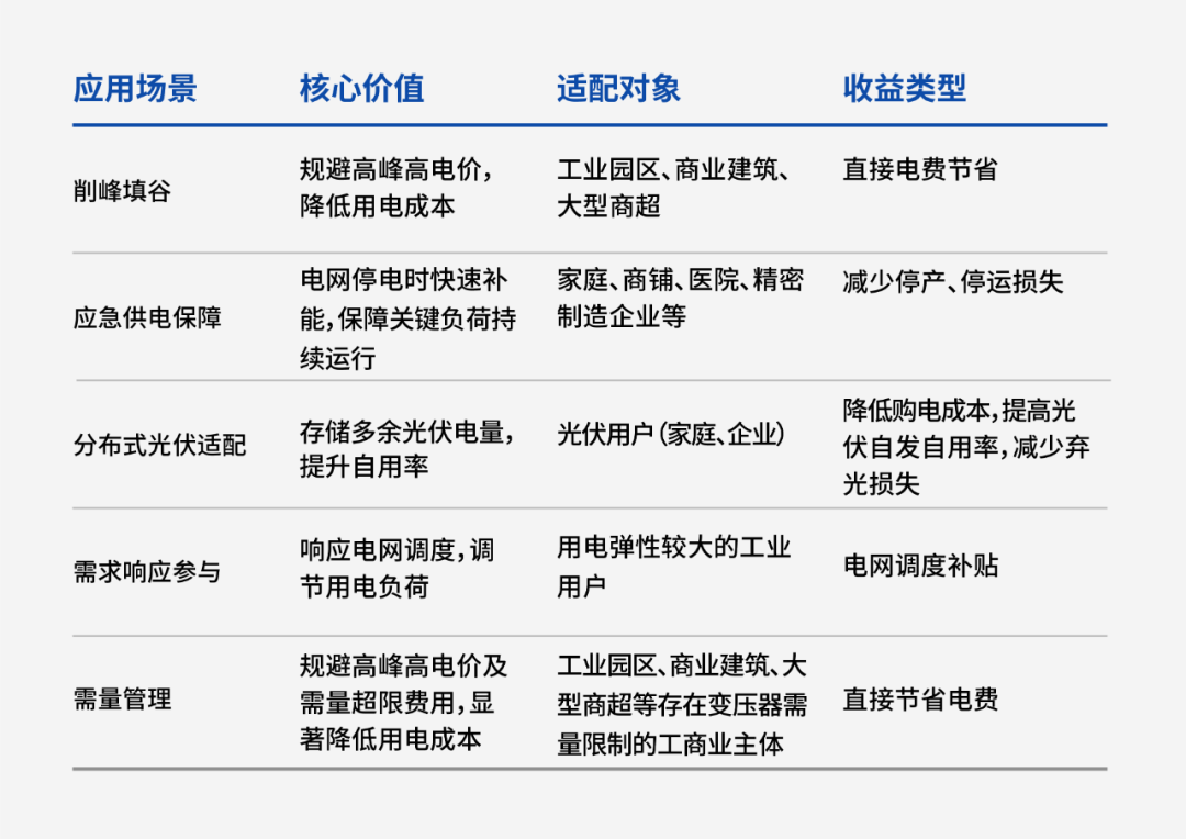 电化学储能在用户侧的应用主要集中在工商业领域,其应用场景可概括为削峰填谷、应急供电保障、新能源消纳、需求侧响应和需量管理。场景特点如下: