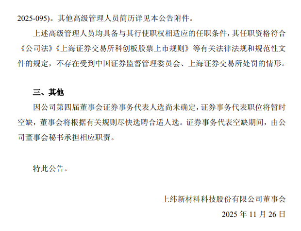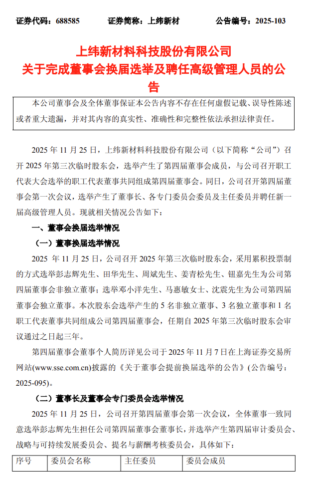 北极星风力发电网获悉,11月25日,上纬新材发布《关于完成董事会换届选举及聘任高级管理人员的公告》(以下简称《公告》)。公告称,公司召开2025年第三次临时股东会,选举产生了第四届董事会成员,与公司召开职工代表大会选举的职工代表董事共同组成第四届董事会。同日,上纬新材召开第四届董事会第一次会议,选举产生了董事长、各专门委员会委员及主任委员并聘任新一届高级管理人员。