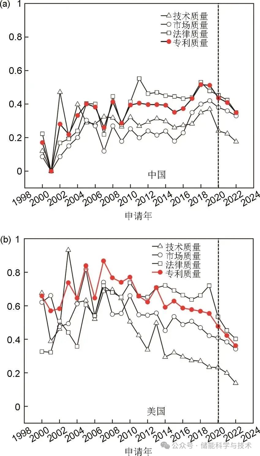 在2010年之前,中美两国专利质量都出现多次波动,可能的原因在于:①此阶段车用锂离子电池技术的产业化前景还不够明朗,研发活动难以从产业界获得长期、稳定的资源投入;②此阶段专利申请数量较少,少量创新主体专利质量的变化就可能导致整体专利质量的波动。