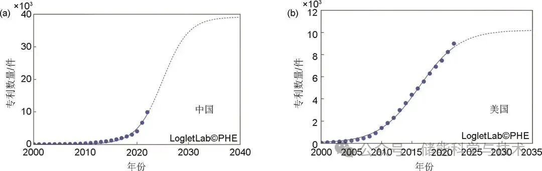 图3 中美两国车用锂离子电池专利Logistic模型组分拟合图