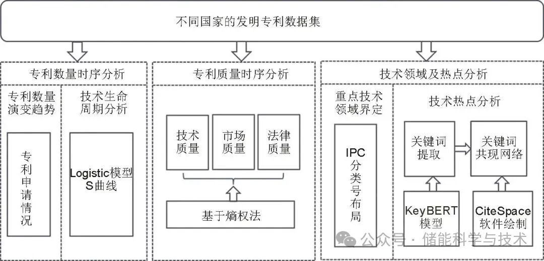 本文基于专利“专利数量-专利质量-技术领域及热点”的分析逻辑,构建如图1所示的分析框架:①专利数量时序分析,包括专利年申请量的演变情况以及采用Logistic模型对车用锂离子电池技术生命周期的定量分析。②专利质量时序分析,采用熵权法从技术质量、市场质量、法律质量三个维度来探究专利质量的演变趋势。③专利技术领域与热点分析,包括利用IPC分类号界定技术领域和采用KeyBERT算法从主要创新主体的专利摘要中提取关键词,并构建关键词共现网络,探索中美两国技术研发的聚焦点、侧重点。