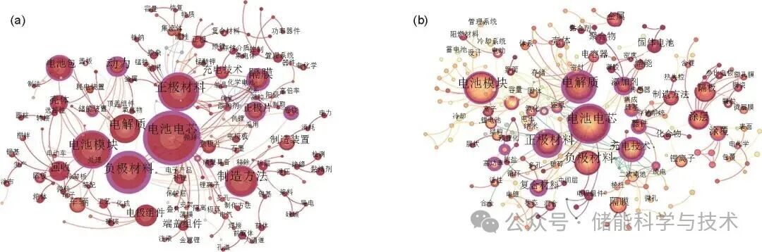 技术领域分布反映了中美两国在车用锂离子电池领域研发的宏观趋势,但要更细致地考察研发的竞争焦点,还需要对两国主要创新主体关注的技术热点进行比较分析。关键词是对文章内容的高度凝练,代表了申请人研究内容的焦点,而关键词共现网络是一种通过分析文献关键词的共现关系,揭示某一技术领域研究热点的可视化图谱,在数据分析与可视化方面具有重要作用。因此,本部分采用CiteSpace软件绘制关键字共现网络来探析中美主要创新主体在该领域的竞争焦点。图6展示了关键词的共现网络,其中节点大小反映了关键词出现的频率,节点越大即代表关键词出现的频率越高,说明主要创新主体给予的关注程度越高。节点间的连线则代表关键词之间存在共现关系。