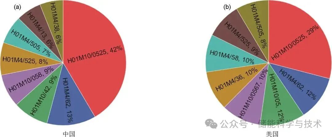 总体上看,H01M10/0525、H01M4/62、H01M4/ 525、H01M4/505是两国专利申请共同关注的重点技术领域,涉及非活性材料成分的选择、活性材料含铁、钴、镍或锰混合氧化物或氢氧化物制备方面的技术,这些都是车用锂离子电池领域的关键核心技术。值得注意的是,两国所重视的技术领域也存在一定的差异。美国对H01M10/05、H01M10/0567、H01M4/36以及H01M4/58予以更多的关注,主要涉及电解质、添加剂和硫族化合物、氯化物、聚阴离子化合物等材料。中国对H01M10/42、H01M10/058、H01M4/13与H01M4/38予以更多的关注,主要涉及电池或电极的制造、高温工作以及合金等活性材料。