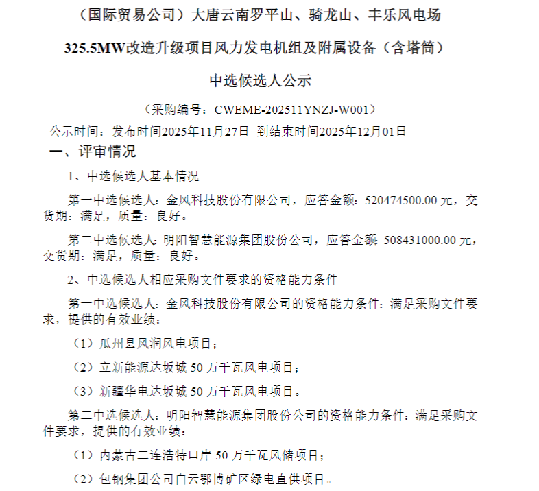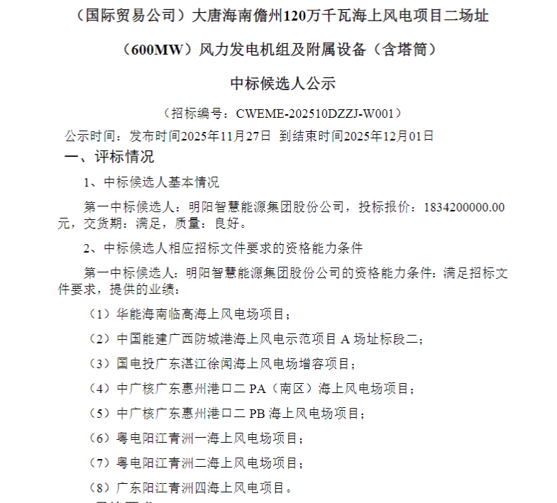 北极星风力发电网获悉,11月27日,大唐云南罗平山、骑龙山、丰乐风电场325.5MW改造升级项目风力发电机组及附属设备(含塔筒)、大唐海南儋州120万千瓦海上风电项目二场址(600MW)风力发电机组及附属设备(含塔筒)、大唐新疆哈密伊州区100万千瓦风电项目标段一(500MW)风力发电机组及附属设备(含塔筒)(二次)中选候选人公示,总装机规模1425.5MW,金风科技、明阳智能、三一重能分别中标。