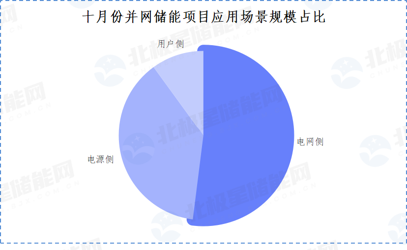 综合来看,三大应用场景10月份并网规模在市场份额分布上呈现较大差异,电网侧储能与电源侧储能占据较大份额,用户侧储能占比较小。