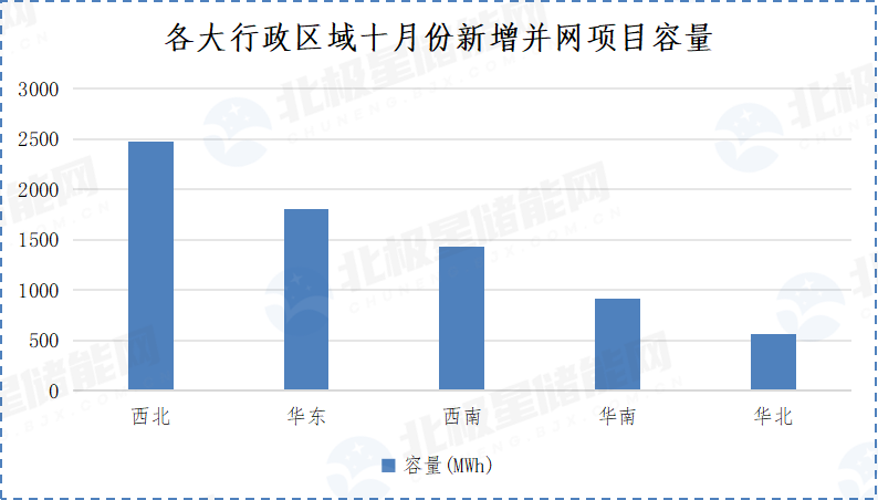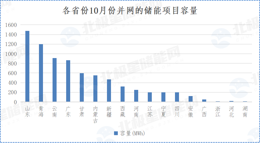 从所处地区来看,10月华东,西北,华东,西南新增储能项目并网容量均超过了GWh;具体来看,新增并网装机容量前三的省份为山东、青海、云南,分别为1472.5MWh、1200MWh、910MWh。