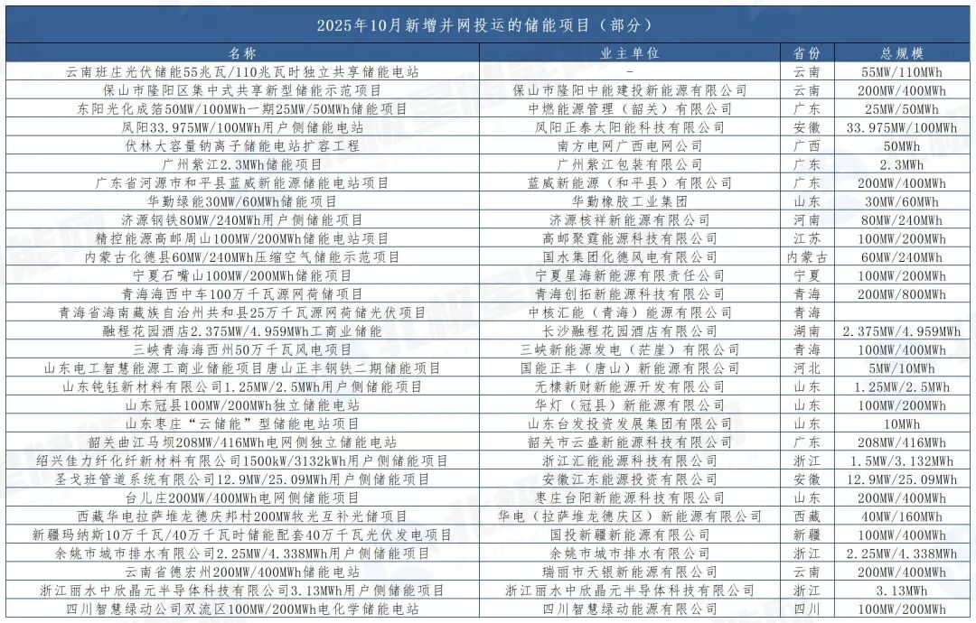 据北极星储能网不完全统计,2025年10月新增并网投运的储能项目共48个,分布在全国17省市。据公开数据显示,48个新增并网项目总规模3.15GW/7.743GWh,与9月新增并网环比下降13%。