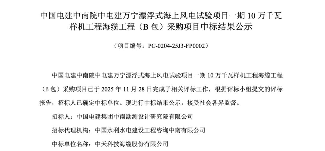 北极星风力发电网获悉,11月28日,中国电建发布中国电建中南院中电建万宁漂浮式海上风电试验项目一期10万千瓦样机工程海缆工程A包、B包采购项目结果公示。根据谈判采购公告显示,A包中标单位为远东海缆有限公司;B包中标单位为中天科技海缆股份有限公司。